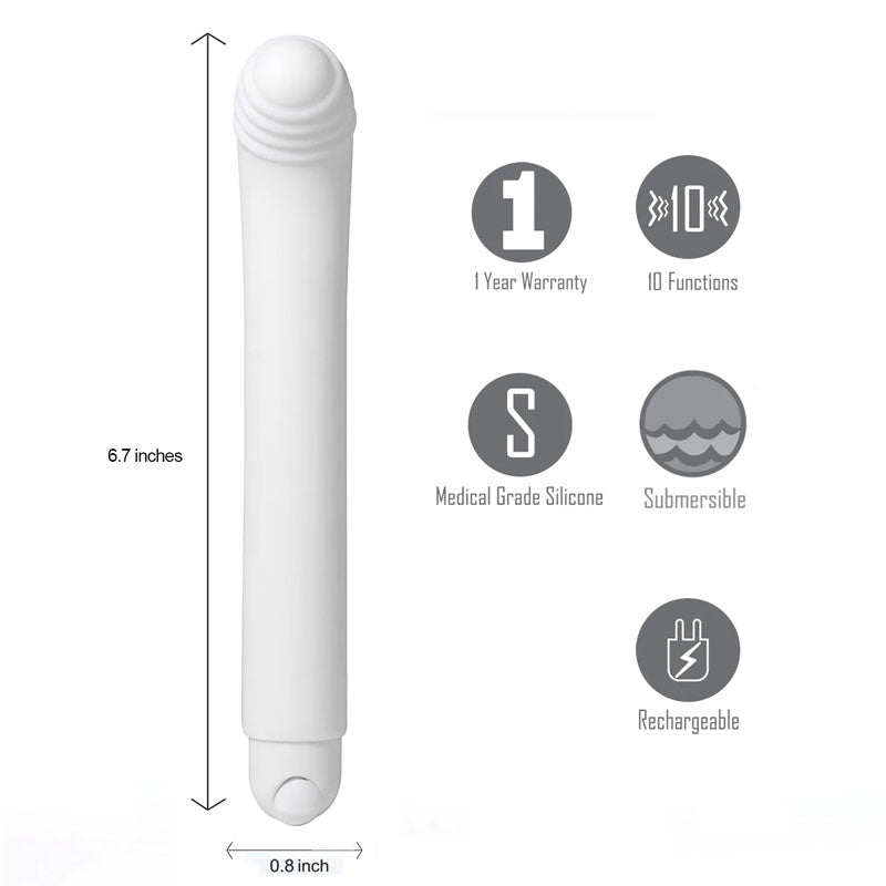 The Misty measures 17 cm in length. All our rechargeable products include our 1-Year Replacement Warranty and include a USB Charging Cable.